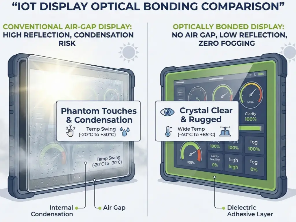 Consider a display mounted on the dashboard of a cold-chain logistics truck traversing rapidly from a -20�C freezer facility into a +30�C humid loading dock. These sudden temperature shifts inevitably cause internal condensation. If the screen employs a standard air-gap touch panel, water vapor will condense between the glass and the LCD cell, leading to total illegibility, phantom touch inputs, and eventual short circuits. To survive this, industrial displays mandate Optical Bondinga process where a specialized index-matched dielectric adhesive (like LOCA or dry film OCA) completely fills the void between the cover glass and the display panel. This eliminates the air gap, utterly preventing internal fogging, dramatically reducing internal light reflections, and significantly increasing structural shock resistance.