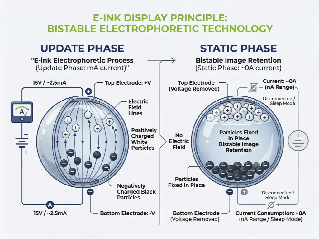 Electronic Paper, widely recognized as E-ink, is the undisputed king of static, ultra-low-power applications. Its dominance is rooted in Bistable Technology. Unlike traditional liquid crystal displays that require a continuous backlight and a constant 60Hz refresh cycle to maintain an image on the screen, E-paper relies on electrophoresis. The display contains millions of microcapsules filled with clear fluid, containing positively charged white particles and negatively charged black particles. By applying a localized electric field, the circuitry physically moves these pigment particles to the surface of the screen. Once they are moved into position, they stay thereindefinitely.